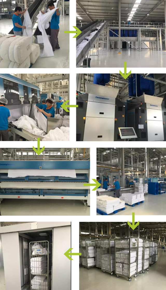 人工将布草分拣后放入传送带中,布草会随着传送带被传送到吊带中,吊带将脏布草掉进洗衣主龙中,进行清洗。经过烘干后的干净布草会被装进白色的吊带中,经机器折叠后人工运送到整理区。