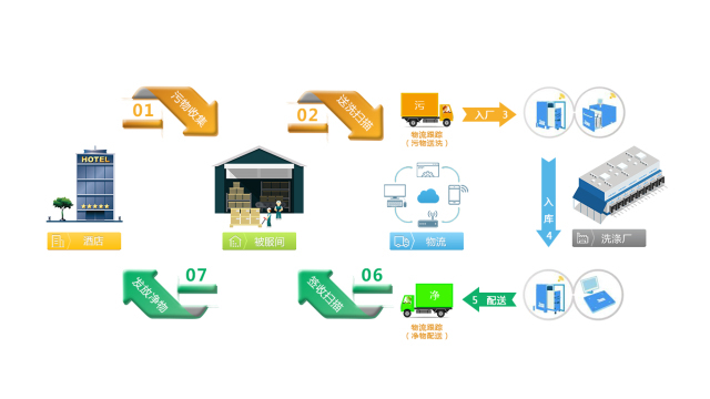 基于RFID技术,为洗涤工厂、医院/酒店(租赁关系)建立智能洗涤管理系统,对布草的送洗、交接、出入库、自动分拣、库存盘点等各个作业环节的数据进行自动化数据采集,并通过各种手持终端及固定采集终端将采集数据实时上传至后台系统,实时掌握布草流转各个环节的状况,实时统计洗涤次数、洗涤费用以及各酒店的租赁数量及租赁费用。实现洗涤管理全程可视化,为企业的科学管理提供实时的数据支持。